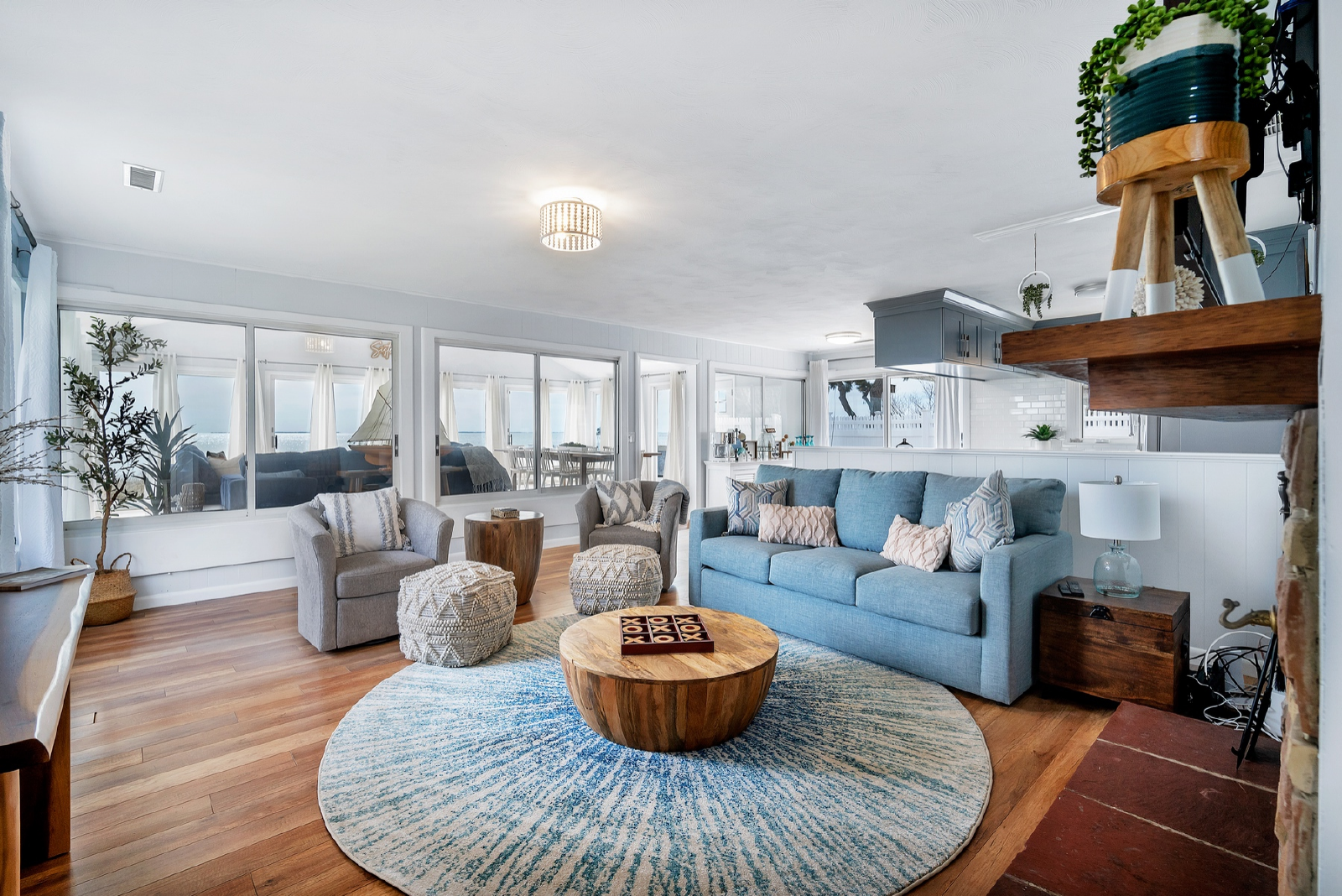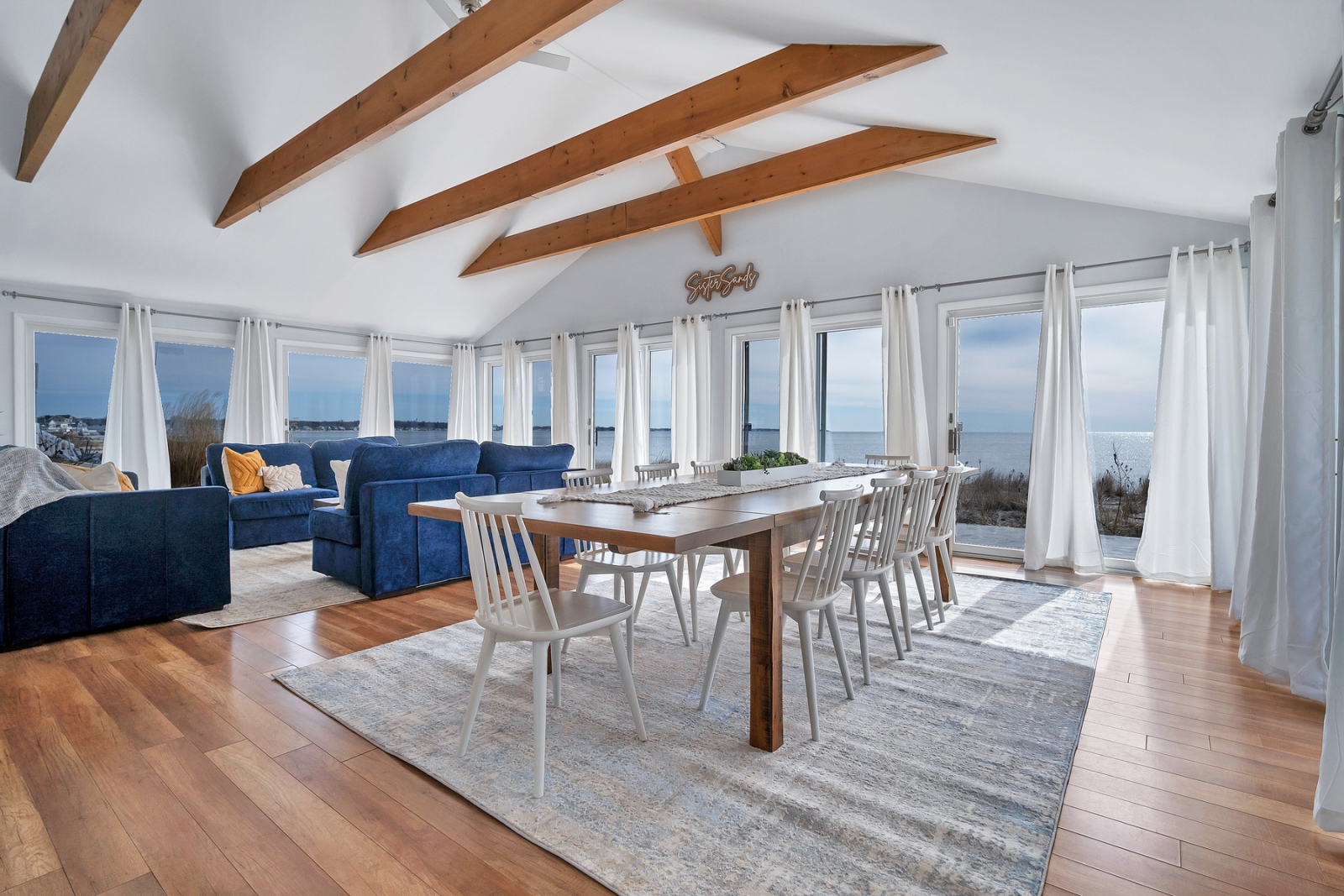 ● Living Room: Breathtaking ceiling-to-floor windows & doors wrapping around the walls to create the perfect seaside oasis. Cozy lounging area with three Love Sac sofas and coffee table chest containing board games for all. A massive 10-seat dining table overlooking the shoreline, enjoy your cuisine while taking in the views.