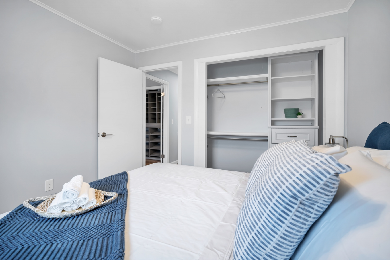 ● Bedroom 2: Queen bed with built-in shelving, full length mirror, closet with storage, usb port lamps, sound machine, and black out shades
