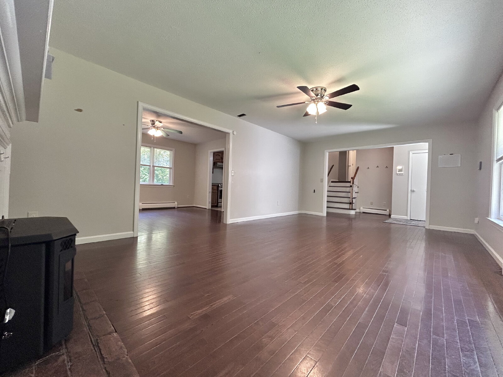 The main living areas are warm and welcoming, featuring a pellet stove for cozy winter nights and efficient mini-splits for cooling in the summer. The home offers four generously sized bedrooms and three full bathrooms, giving comfort and convenience for family and guests alike.